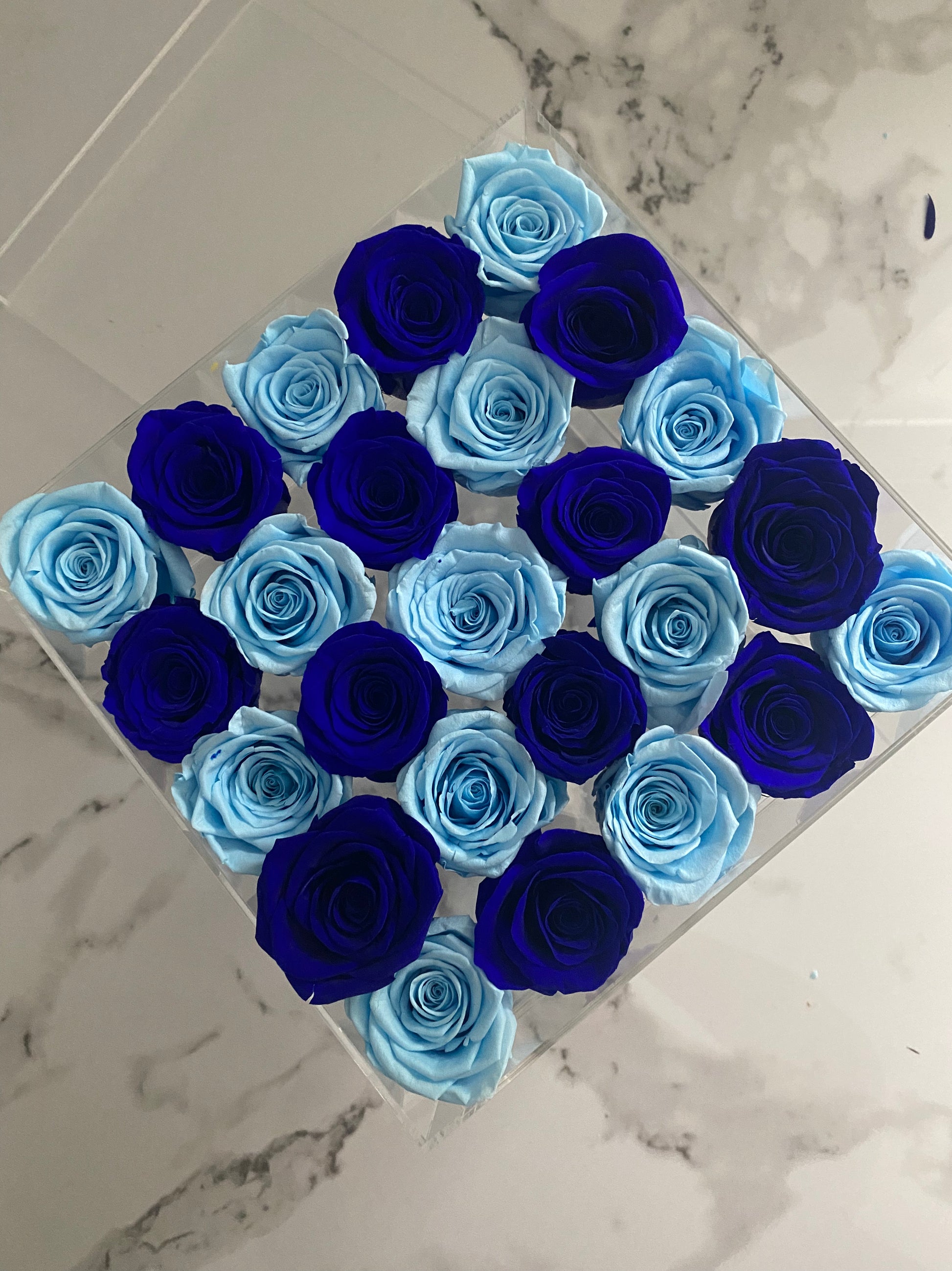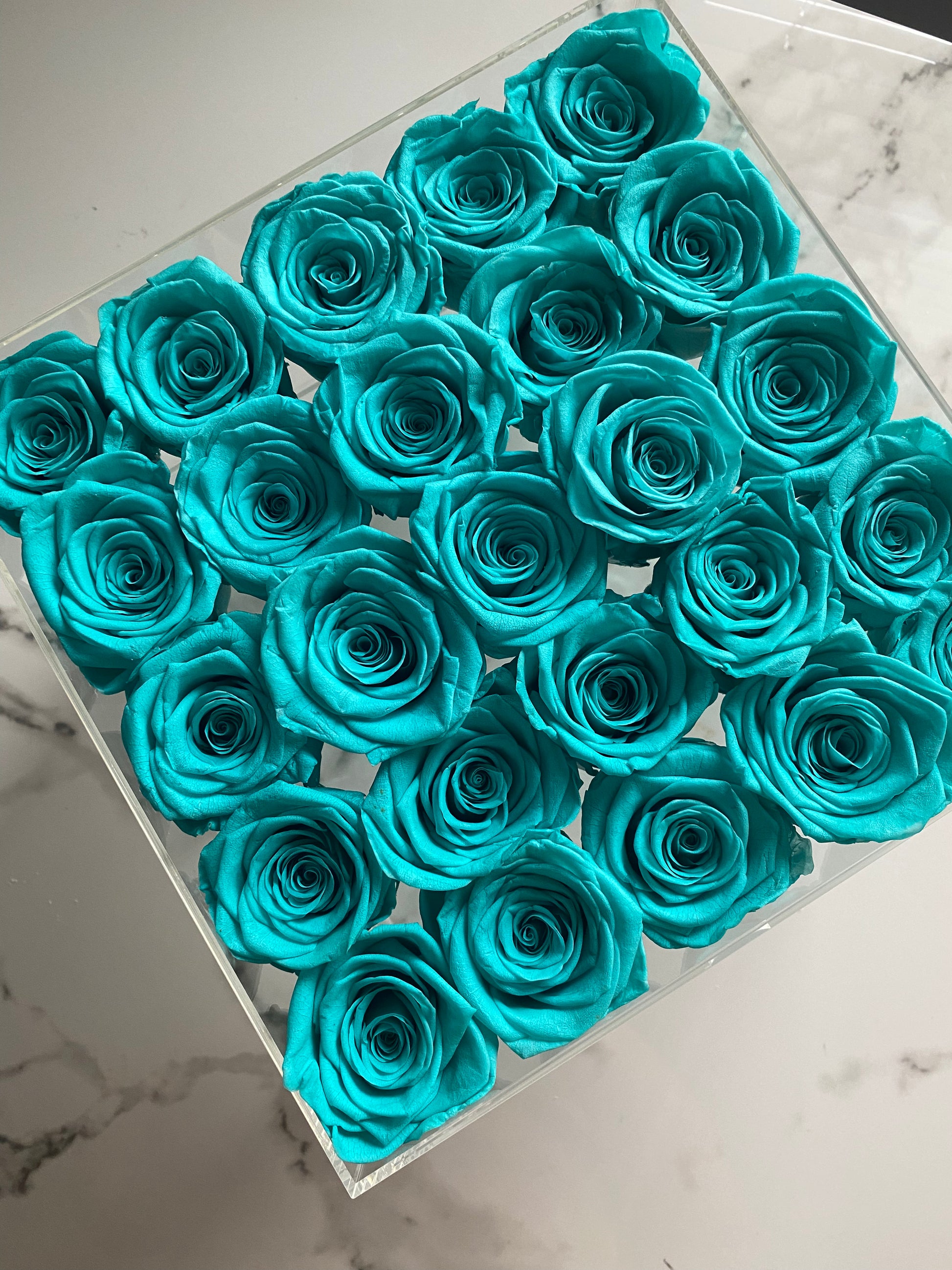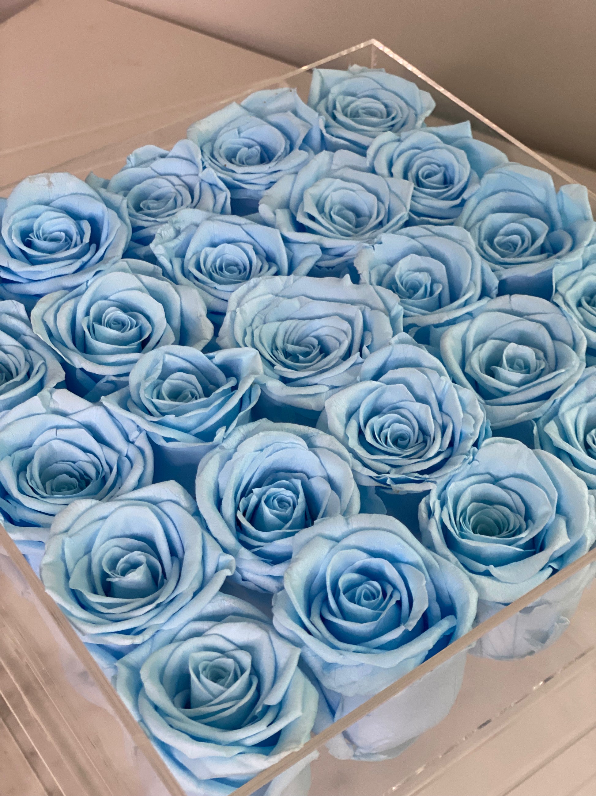 Shower your loved ones with our largest arrangement of beautiful preserved roses. Displayed in a museum-style, clear acrylic container, this one-of-a-kind arrangement features 25 handpicked roses preserved in our proprietary non-toxic solution to last up to 3 years.